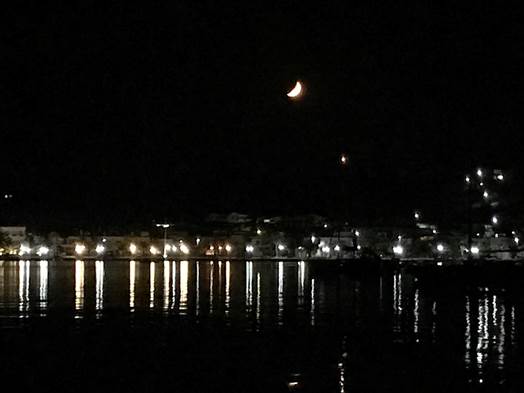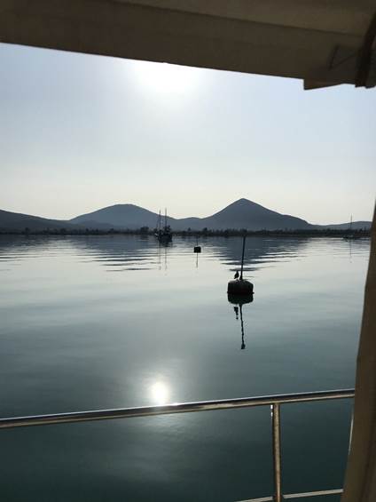 Nous sommes accostés au port public de Porto-Héli, à l’abri de la mer dans cette baie fermée, mais le vent peut rester un danger sérieux, notamment lorsqu’il souffle de sud.