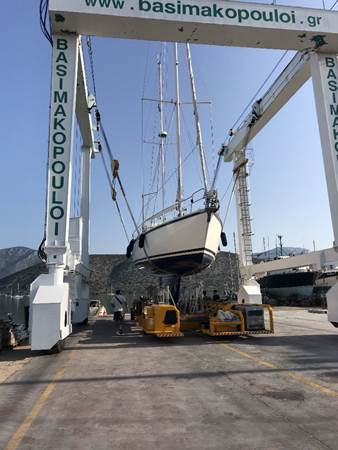 A 09h00, ponctuel à son habitude, le chantier Basimakopoulos récupère Amarante, et le place sur son ber pour l’hiver.