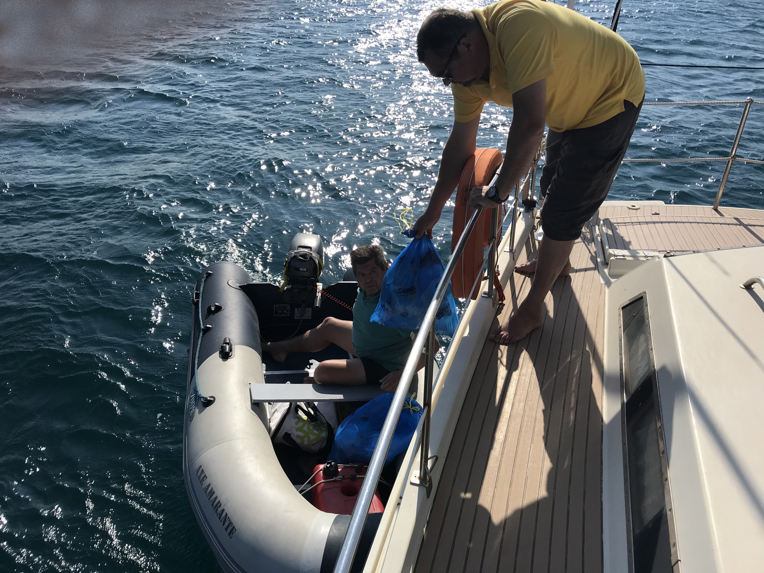 Le retour des courses se révèle finalement assez délicat, nous avons 15 nœuds de vent dans le nez et une cinquantaine de kilos de ravitaillement, le tout avec un bon clapot.