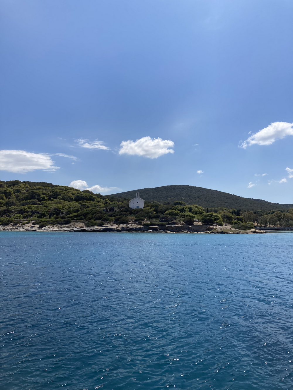 Nous avons passé la nuit au mouillage nichés entre quelques îles privées avec magnifiques villas les pieds dans l’eau, ports privés, vignes, oliviers et même chapelle pour couronner le tout ! Bref, tout le matériel nécessaire pour être bien à cet endroit‑là.