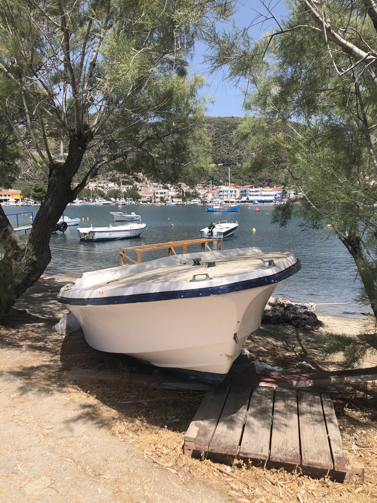 C’est aux côtés d’une épave de cargo que nous trouverons une place au mouillage dans la baie de Poros, après moults petits ronds dans l’eau, façon chat qui cherche un genou confortable.