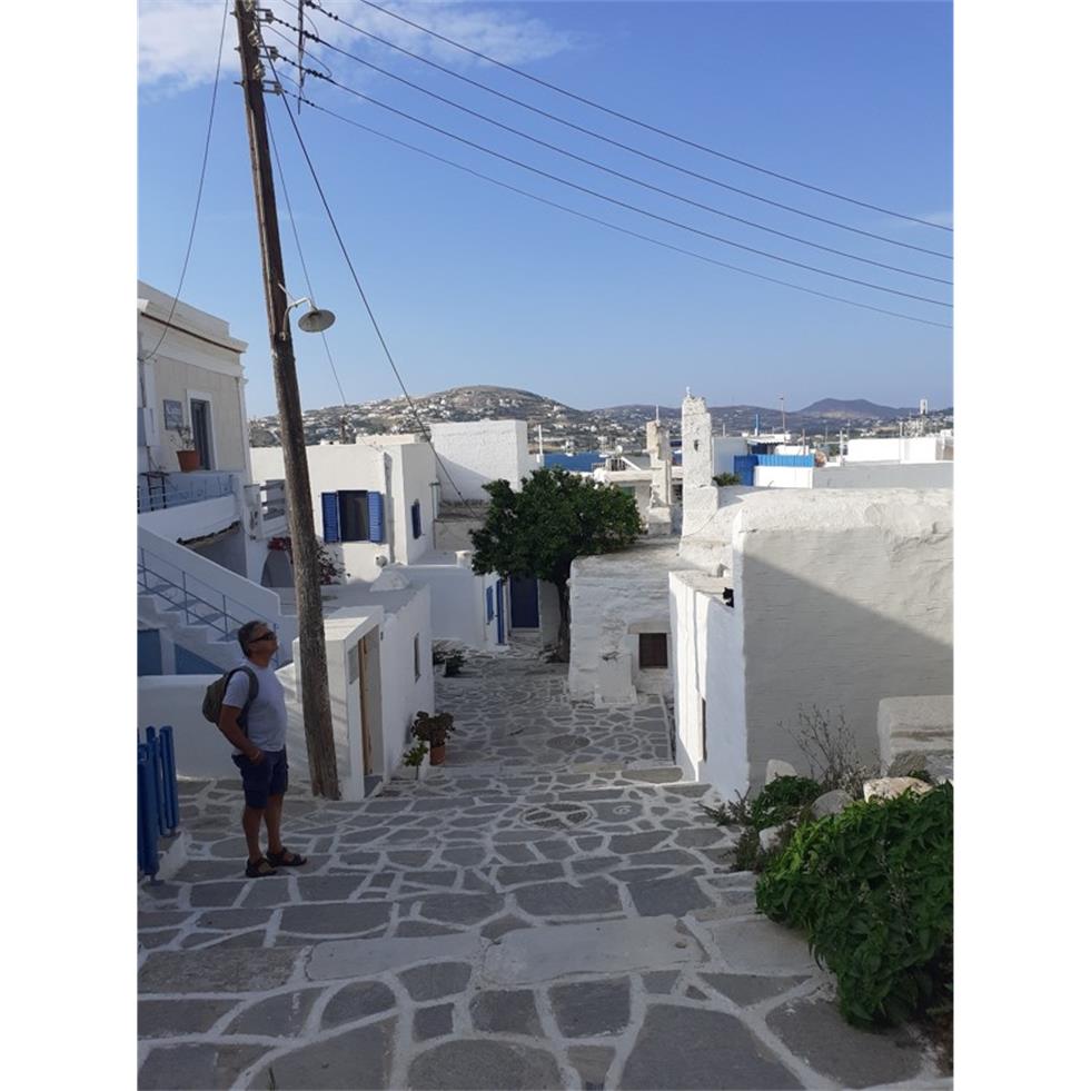 Nous sommes proches du point le plus haut de Parikia, et on voit au loin la baie dans laquelle Amarante est au mouillage.