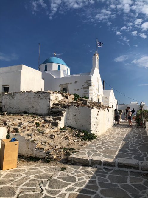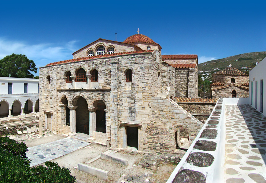 En premier lieu, nous faisons honneur à la basilique de la Panaghia Katapoliani (*), plus grand sanctuaire paléochrétien des Cyclades et troisième plus grand de Grèce.
