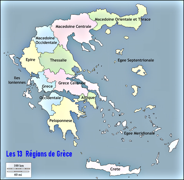 - 13 périphéries (περιφέρεια / periféria) ou « régions », et la communauté autonome du Mont Athos.