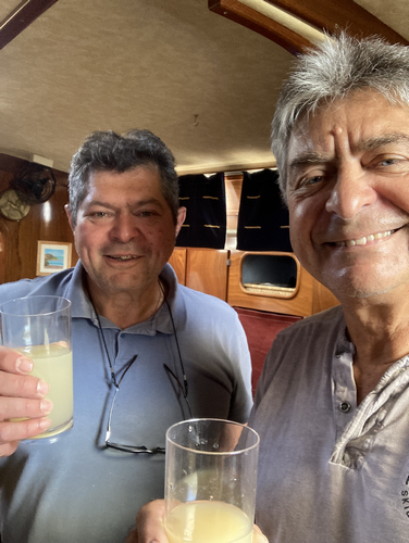 Ce premier jour de juillet, nous sommes invités à prendre l’apéritif à bord d’un bateau voisin dont le propriétaire est une connaissance de longue date de Caposud.