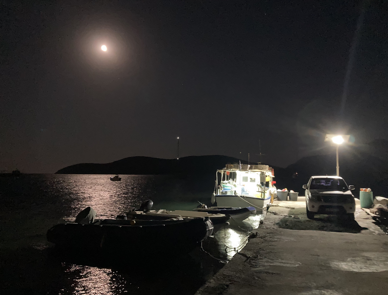 Le ponton de pêche accueille l’annexe dans le clair de lune.