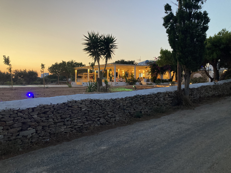 Quand tombe le soir, nous mettons l’annexe à l’eau et partons dîner à terre sur Antiparos.